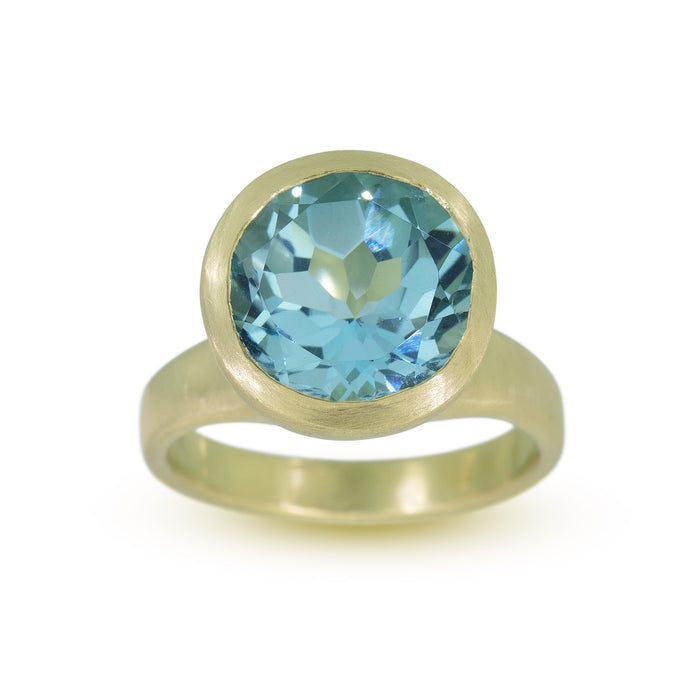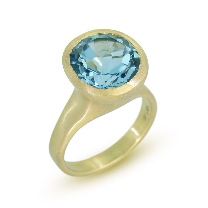 This new cousin to our Amphora ring makes a beautiful statement. It features a 12mm round faceted blue topaz and sits a little taller on the hand. Set in 14K green gold, this is a new classic in our collection.